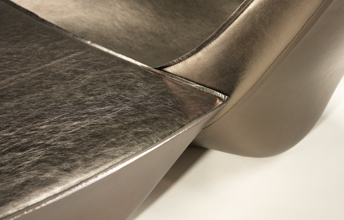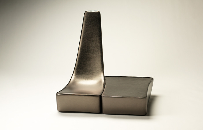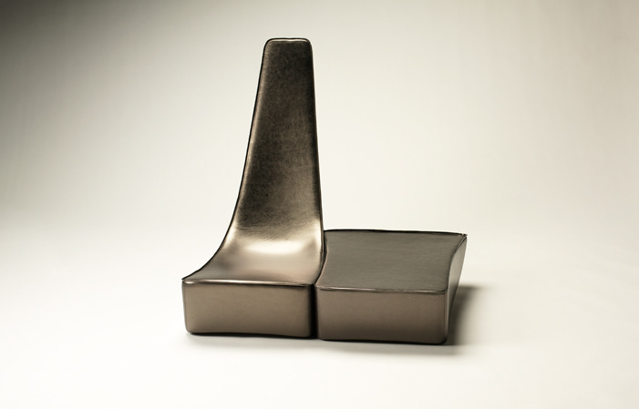 The J-low chaise and table/ottoman is a 21st Century reinterpretation of a primitive hand-crafted African tribal chair, using advanced computer software and a CNC (computer numeric controlled) machine. The contrast between the ancient hand-crafted wooden seat and the modern leather-covered plastic J-low chaise and table/ottoman speaks to the tension between old and new, past and future, while maintaining an essential aesthetic link.